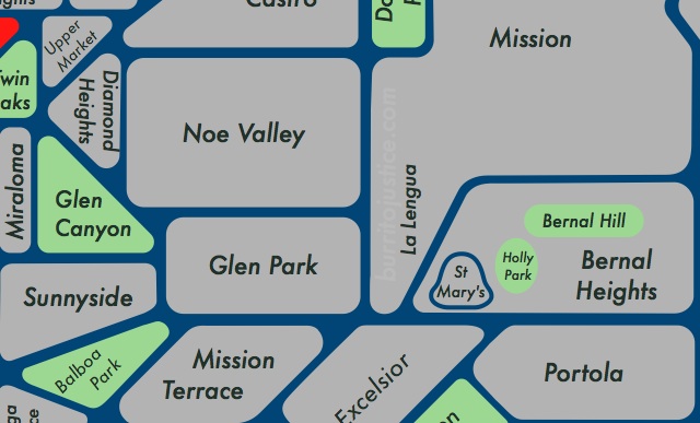 Burrito Justice, the uppity chief spokesperson for the uppity La Lenguans, has created a pleasing new map of San Francisco that brings linear order to our nonlinear city and geographic clarity to anyone who simply has a hard time keeping track of which neighborhood is which: