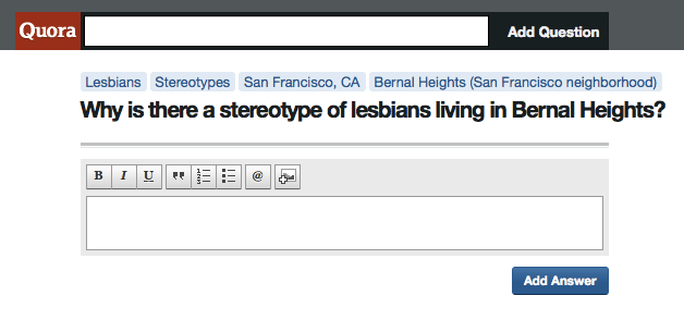 I’m not going to touch this one — because a) I’m a hetero guy, and b) I spend more time at El Rio than Wild Side West, and c) I wasn’t aware of the stereotype. (“Dang, I thought the lesbians lived on Valencia!“) But hey, if you’re feeling game, feel free to answer either at Quora, or in the comments here.