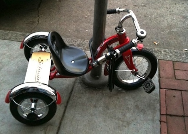 Badassitude comes in many forms, and apparently it starts at a very young age. Molly Samuel, Bernalwood’s own naturalist-in-residence, snapped this pic of a very badass tricycle parked in front of Liberty Cafe. Boys and girls, this is how we roll!