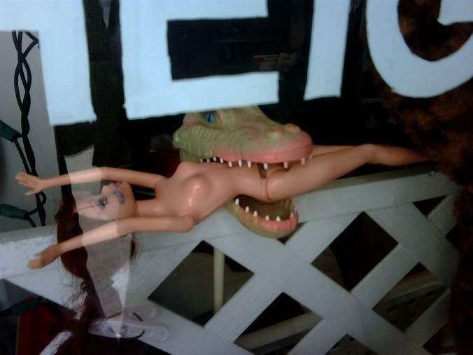 NEWS FLASH: Glamorous Bernalwood resident Barbie has been attacked by a marauding reptile! Reader Jean Pedigo captures the drama: