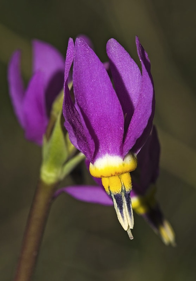 Dodecatheon has an interesting pollination scheme: Pollen release occurs when pollen-collecting bumblebees visit the flowers and rapidly vibrate their ‘indirect flight muscles’ at a high frequency, causing the plant’s anthers to forcefully release a cloud of pollen into the air and onto the bee.