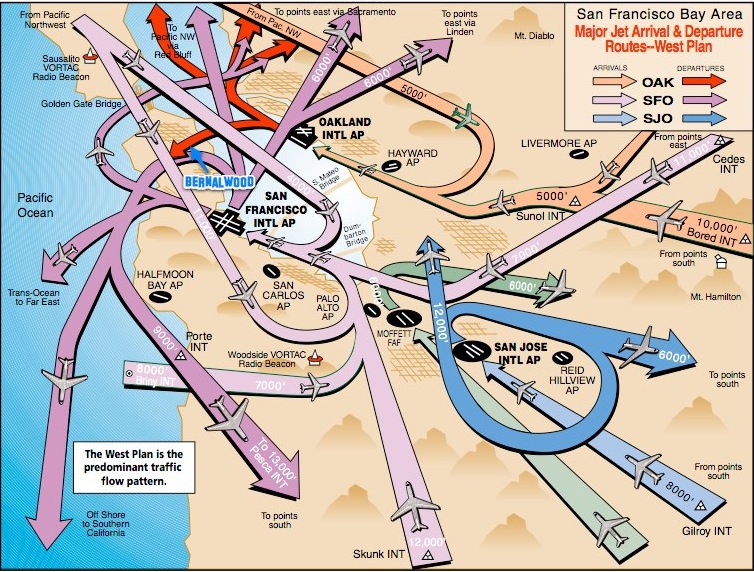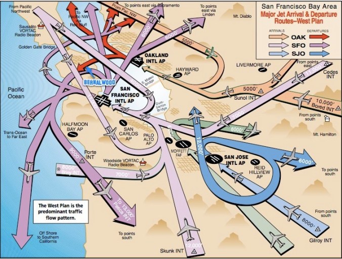 Indeed, the local flight patterns are pretty easy to follow, once you familiarize yourself with this map, which reveals the invisible thoroughfares commercial aircraft use when coming and going from SFO and OAK.