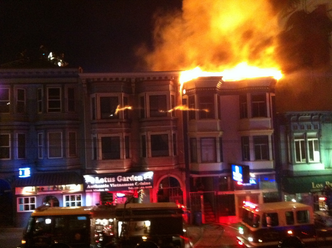 Major fire and lots of sirens tonight on Mission Street at Valencia in the West Bernal/La Lengua Liminal Zone. One of the buildings between Blue Plate and Royal Cuckoo caught fire and spread to the adjacent structure. Will update as we learn more.