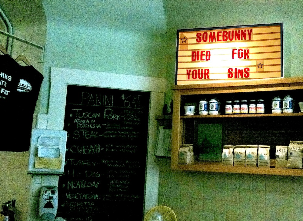 Andy Taylor took this photo inside Avadano’s on Cortland Street. This Easter, it looks like they’re serving up a blend of Hello Kitty cute, carnal omnivorous pleasure, and Catholic guilt. A delicious combination. Happy Hossenfeffer!