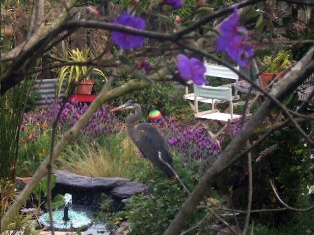 These are the Great Blue Heron who visit my yard with a pond on Peralta Avenue. This bird visits frequently! The first one is at the pond… waiting for the goldfish to surface… she has definitely scored in that department.