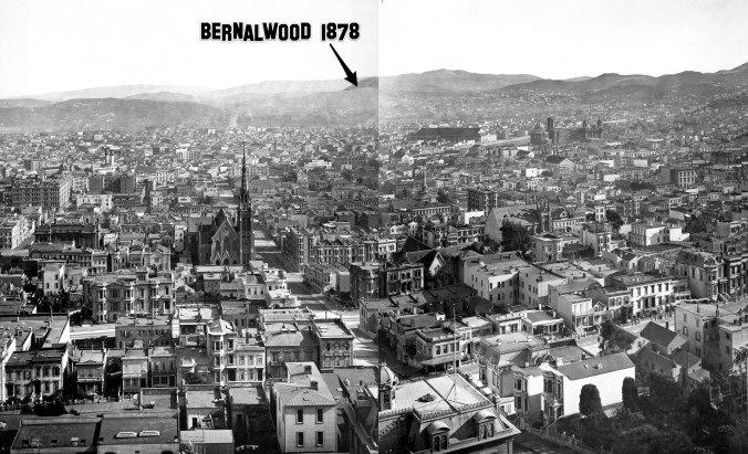 That first light-grey hill in the background is Bernal Heights. There aren’t many buildings to speak of in 1878 Bernal, nor any trees or large-scale vegetation. But what they did have then that we don’t have now are the two Lost Peaks of Bernal Hill, which are clearly visible just to the east of the present-day summit: