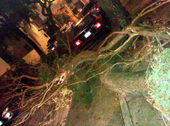 In case you want a little warning when a tree falls near you, here’s the sound it makes, as heard by most of the street. First it sounds like “somebody stepping on cardboard boxes,” then “a bunch of firecrackers going off, but a bit too quiet.” Then comes the crash, and the impromptu block party when everyone comes out to see what the hell just happened.