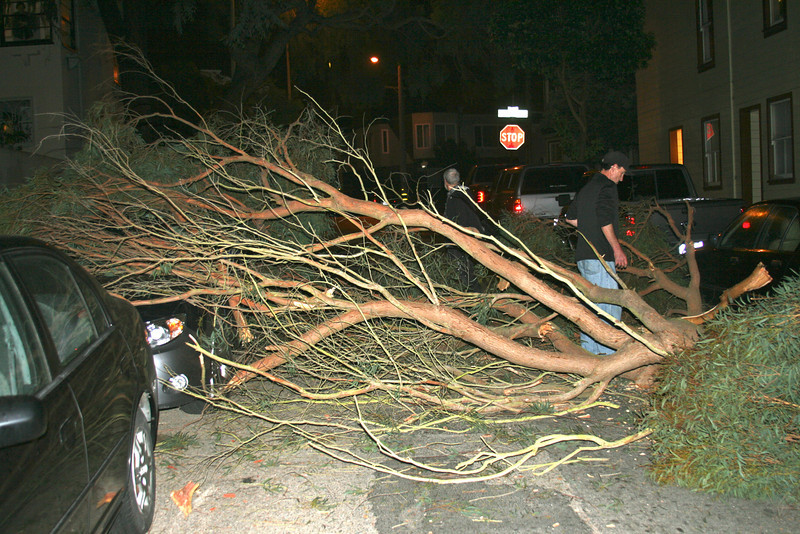 It’s actually just one of the bigger branches of the eucalyptus trees that line this block. One neighbor, who was heaving an axe at the obstruction within minutes, and who gave his name as “John Bunyan,” said the trees were planted in the seventies by another long-time Bernal resident, “who was feeling civic-minded.”