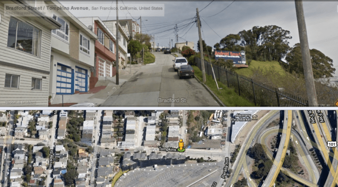 And not only that, they also, also concluded that the steepest paved street in San Francisco — and quite possibly the entire world! — is a 30-foot section of Bradford Street near Tompkins, just north of the Alemany Farmer’s Market.