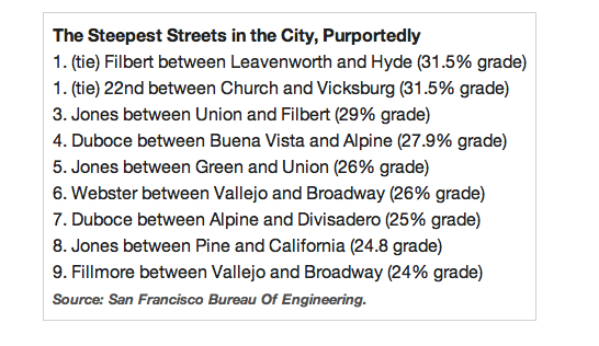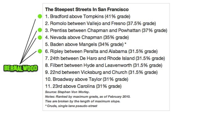 This probably does not come as news to the Citizens of Bernalwood, but there are some pretty steep hills in our neighborhood-on-a-hill. And some pretty steep streets that climb those steep hills too. Yet according to the “official stats,” Bernal’s streets are not the steepest: