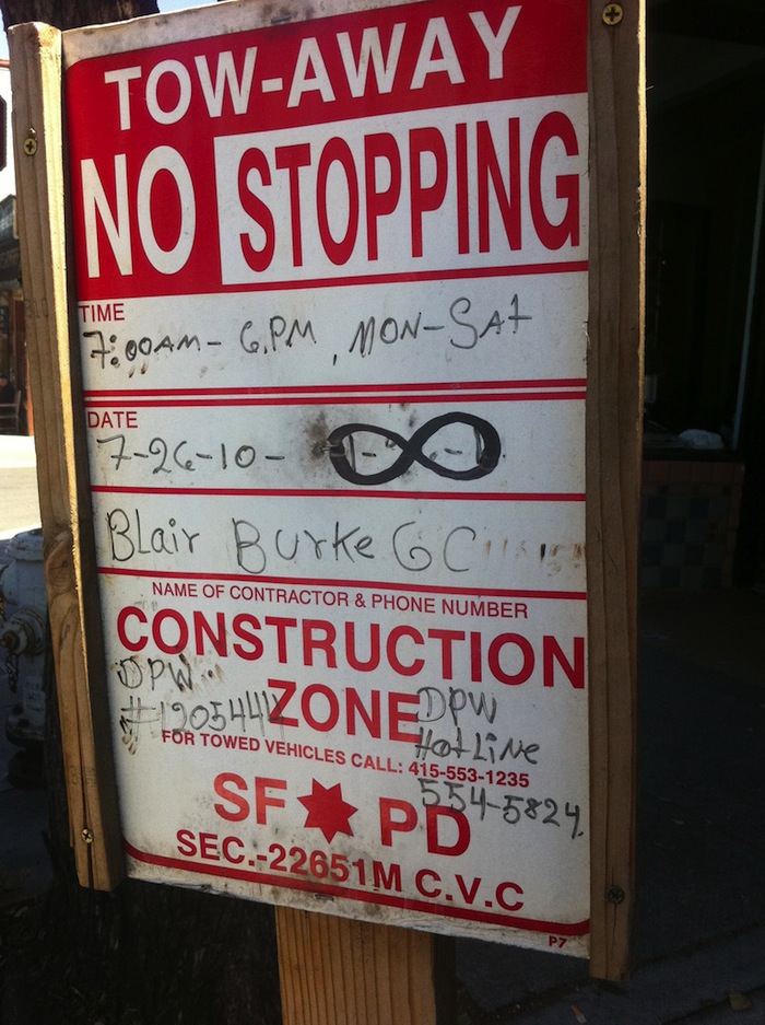 David Spector shared this photo of a construction zone/no parking sign that’s been in place on Bennington near Cortland for at least a year… and apparently, there’s no end in sight.