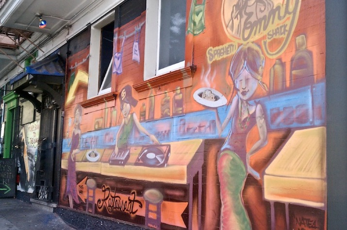Remember when that loose-screw-guy defaced the new mural at Emmy’s Spaghetti Shack back in May? The whole incident was unfortunate, but there’s now a replacement mural to fill the void. Several readers notified Bernalwood that the new mural was up (thankyouverymuch!), and Laura Muhlhammer sent us a few great snaps. Laura says: