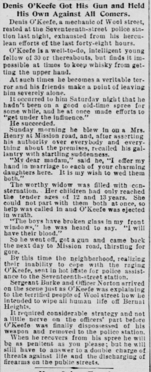 In 1892, a Wool Street resident named Denis O’Keefe allowed whisky to “get the upper hand,” on his otherwise intelligent nature. During his “good old-time spree,” Mr. O’Keefe propositioned two young sisters, and, when rebuffed, flew into a rage which culminated in the shooting of guns and much consternation among the neighbors.
