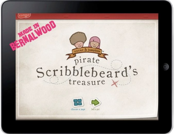 The app is called “Kidoodle: Pirate Scribblebeard’s Treasure with Oscar & Josephine,” and I downloaded it (for $3.99) for Bernalwood’s Cub Reporter, age 4, who is world-famous for being a thorough and rigorous iPad app tester.