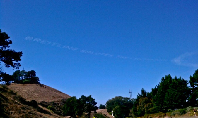 It’s a little challenging to read, but Rihannon Charisse captured some Fleet Week-related skywriting over Bernal today: