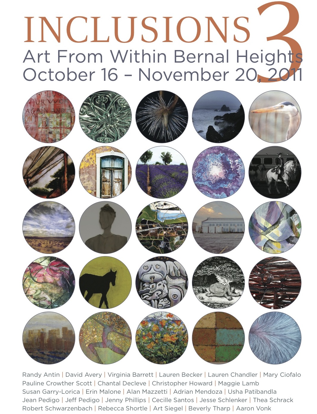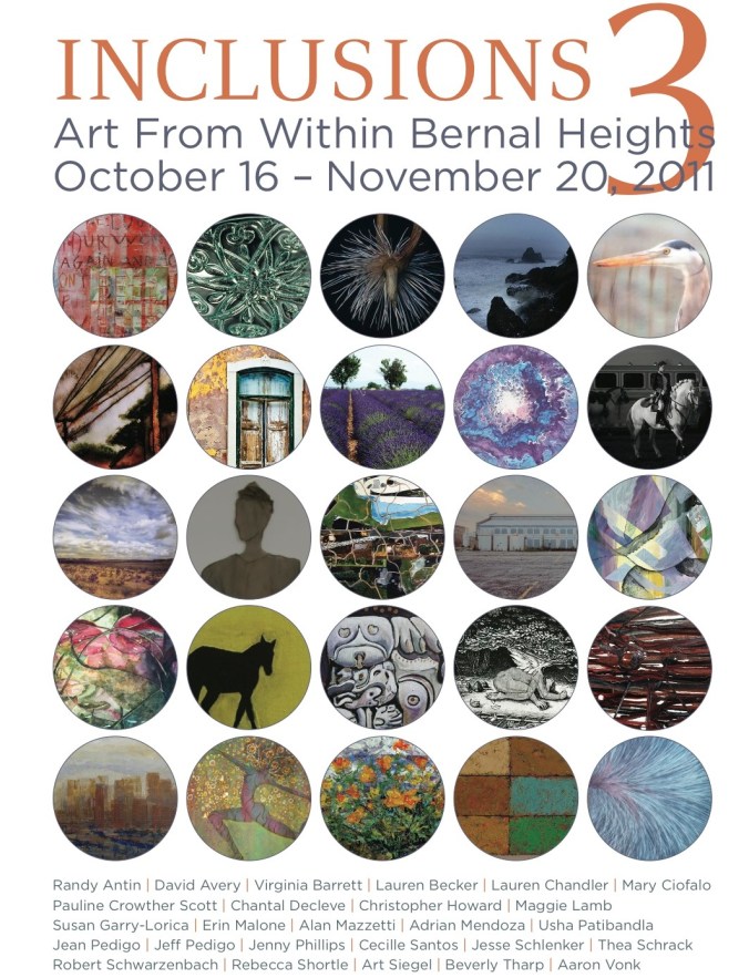 It is with great pleasure and excitement that we present, Inclusions 3 – Art From Within Bernal Heights. This year’s annual show features an eclectic array of paintings, sculpture, photographs, assemblage, prints and glasswork from 26 Bernal Heights resident artists. Each year this show highlights the diverse artistic talent, among us, offering an opportunity to celebrate, and support, the creativity within our local community.