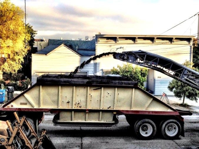 There was some big excitement happening on Precita Avenue this morning, as I awoke to the thrilling spectacle of an asphalt scraper-flume thingy doing its asphalt-launching trick right outside my home.