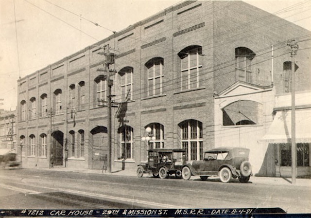 But before we get to that, let’s back up a few decades to recall what that site looked like before Mission Bowl — and the reason why I was confused about its existence. My understanding had been that the present-day site of the Big Lots etc. used to be a streetcar repair facility operated by the Market Street Railway Company. And indeed, for the first half of the 20th century, that’s exactly what it was. Here’s how the “car barn” looked in 1921: