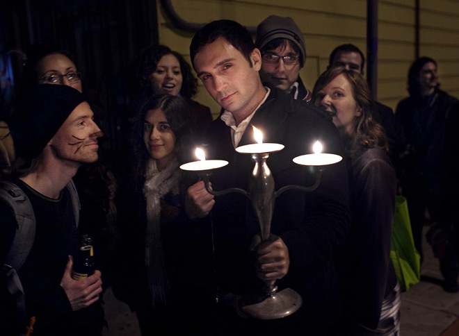 New Year’s Eve procession in Bernal Heights, the group of revelers walked onto Cortland Avenue singing “Auld Lang Syne” just prior to midnight.