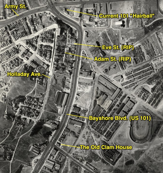 First, look to the east: There’s no 101 freeway yet; instead, Bayshore Boulevard carried traffic as US 101. Also clearly visible is the micro-hood centered along Adam and Eve Streets, all of which was plowed under when the freeway was built.