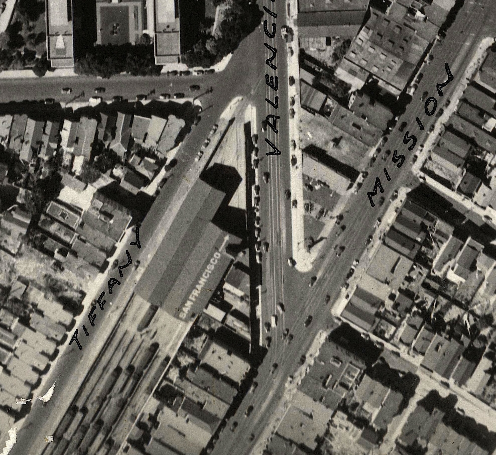 A little farther west, on Tiffany near the junction of Valencia and Mission, there was a streetcar shed, with “San Francisco” painted on the roof, and an arrow pointing north. (A navigational aid for aviators, perhaps?):