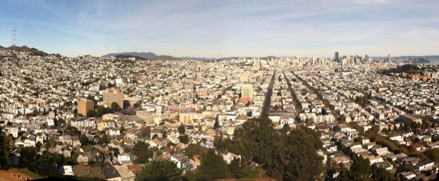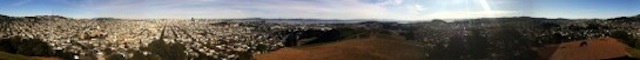 I’m a fan of our little Sutrito Tower, but the fact that it’s fenced off makes it impossible to take in the full 360° panorama of gorgeous views we have at the top of Bernal Hill. So I thought I’d try to create a synthetic panorama from pictures taken just outside of the fence, and stitch them together with software. My first effort, using the Autostitch app for iPhone, didn’t turn out too well — lots of double-vision blurriness at the seams. Still, that was better than Photosynth, which refused to even try stitching when it thought I’d moved too far between shots.