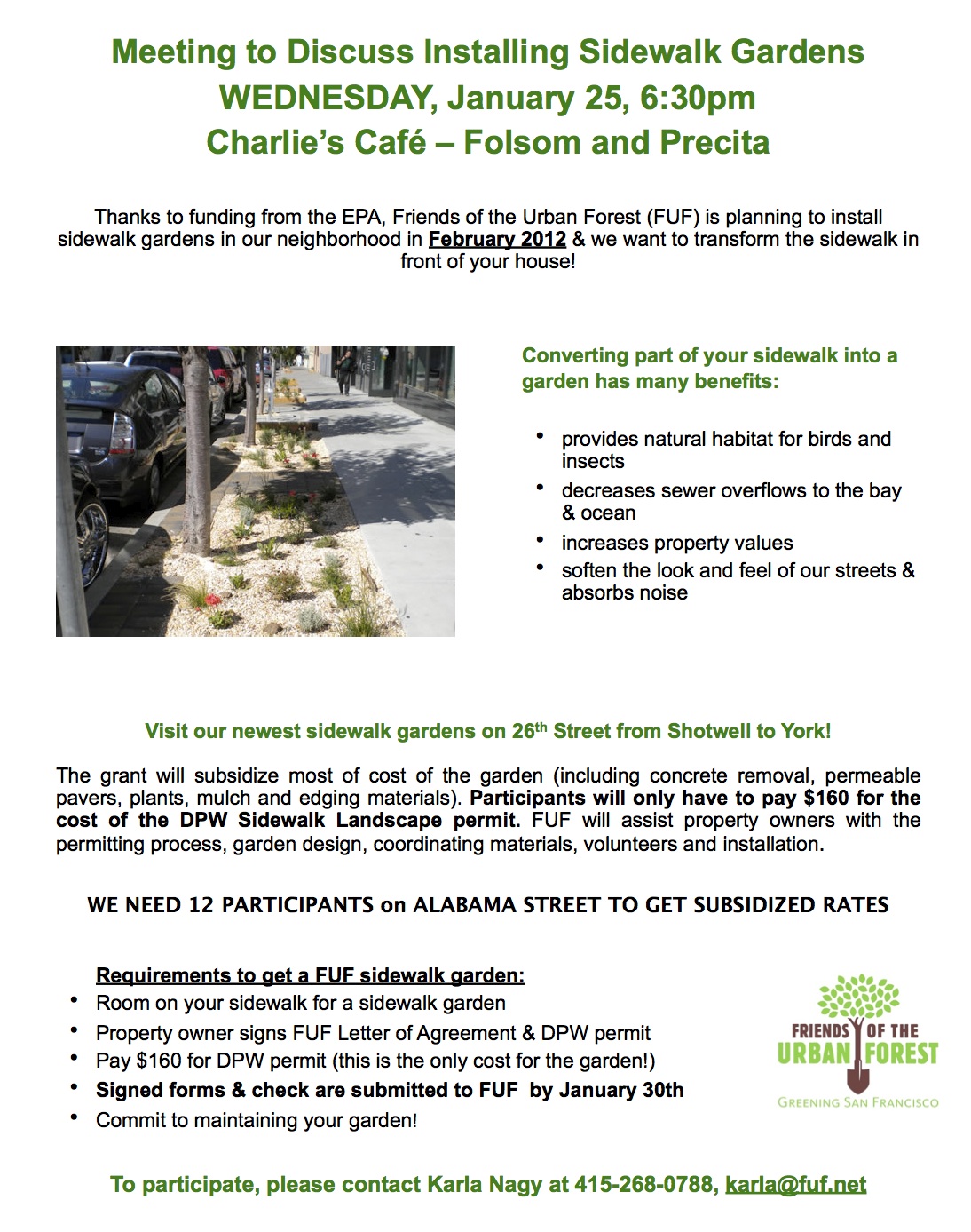 Friends of the Urban Forest is doing two sidewalk plantings in Bernal in Feb/Mar and May. If people are interested they should contact Karla Nagy (karla@fuf.net or 268-0788), the FUF project coordinator.