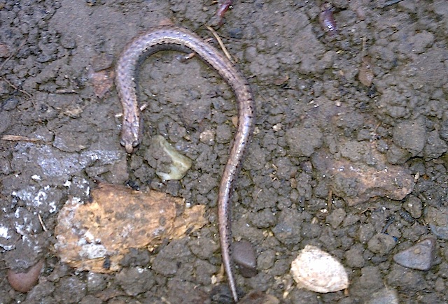Fascinating. Though the creature looks somewhat snake-like, this closeup of a California slender salamander grabbed from Wikipedia reveals that they actually walk on legs, and are actually rather cute (in that salamander sort of way):