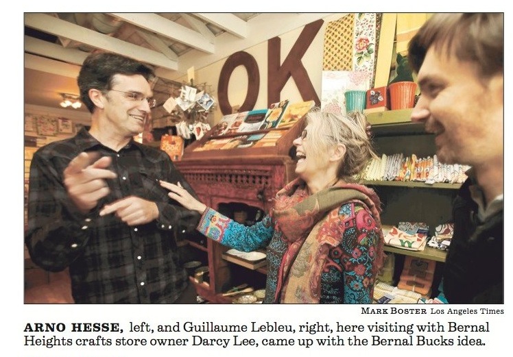 Our very own “weird little borderline utopia” here in Bernal Heights makes an appearance on the front page of today’s Los Angeles Times, in an article about the unique (and fabulous) Bernal Bucks local currency program.