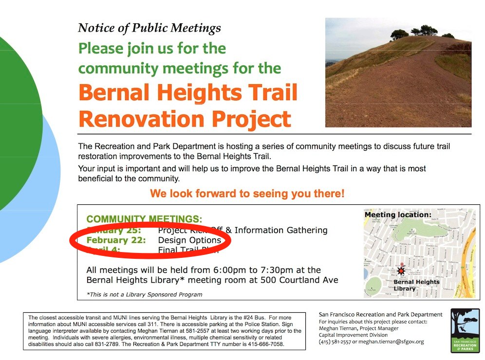 Sorry for the late notice, but the City’s Department of Recreation and Parks is having a design review meeting TONIGHT at 6 pm in the meeting room of the public library on Cortland Street to discuss the plan to restore and upgrade the Bernal Hill trail network.