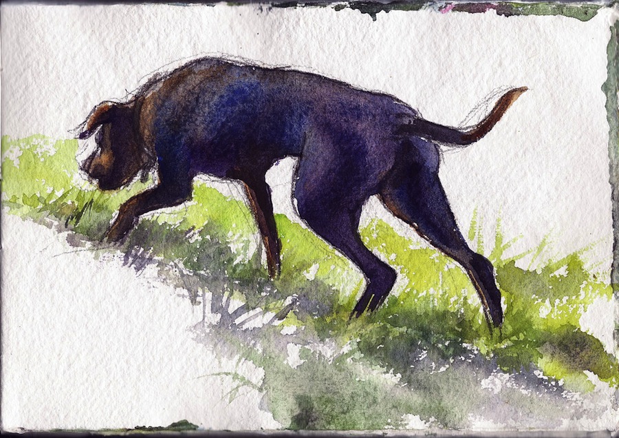Neighbor Laurie, who has a wonderful propensity to paint watercolors instead of snapping photos, brings us this terrific image that captures the Wild Kingdom drama of a canine/rodent confrontation on Bernal Hill. She writes: