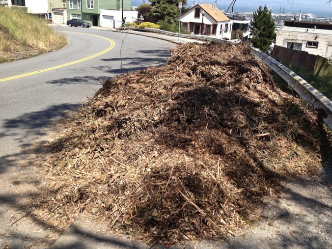 On Sunday afternoon, while on a routine journalism patrol atop Bernal Hill, I noticed a large pile of vegetation that had been unceremoniously dumped in the middle of the sidewalk on the south side of Bernal Heights Boulevard. Grrrrrrrrrrr.