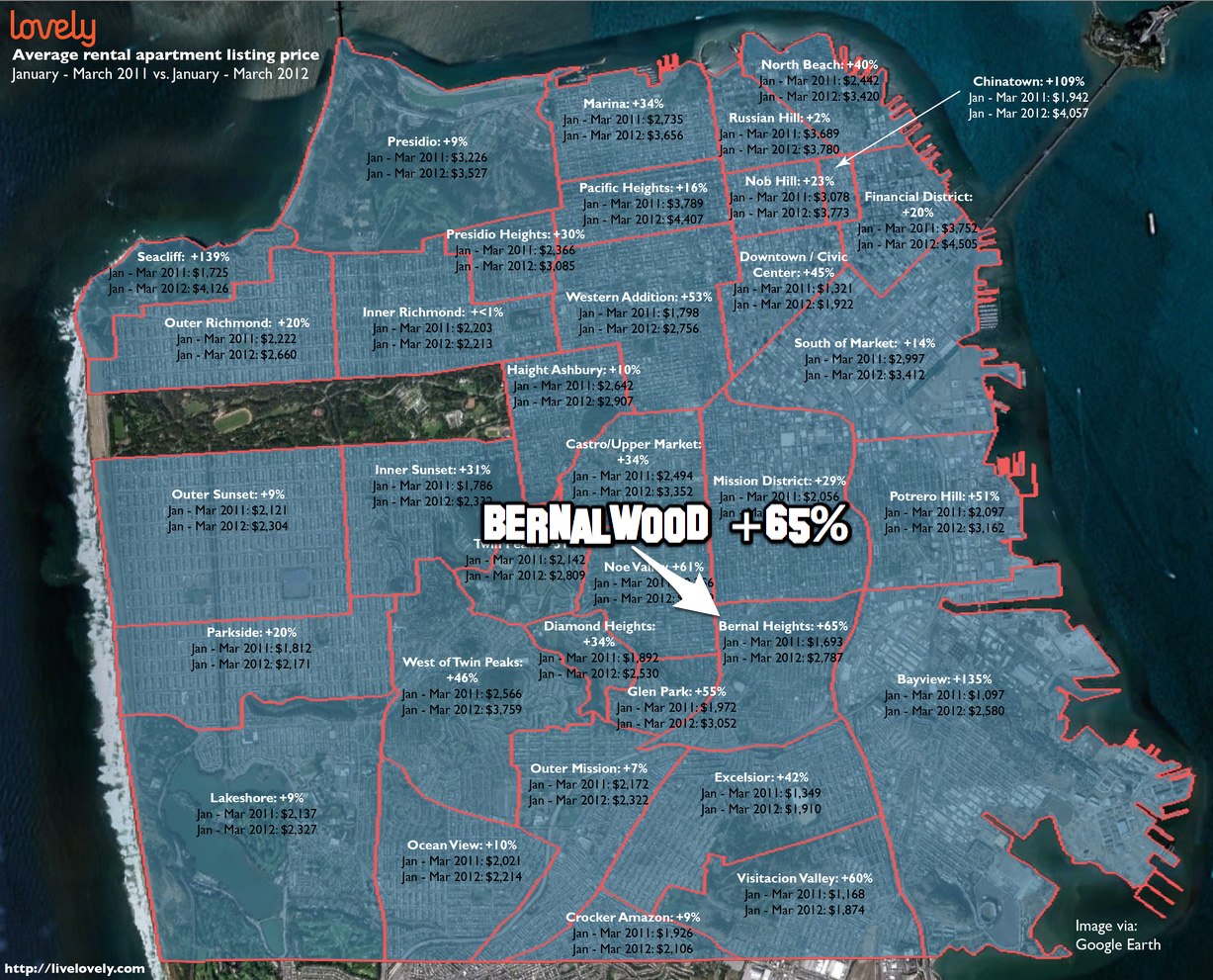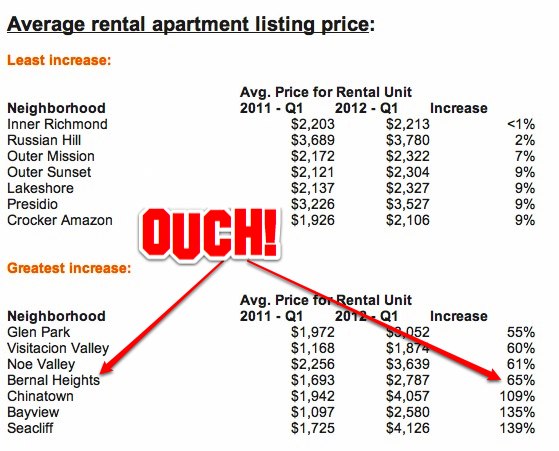 Our real estate-obsessed friends at CurbedSF bring the jaw-dropping news that the average price of rental housing in Bernal Heights increased by 65 percent during the last year: