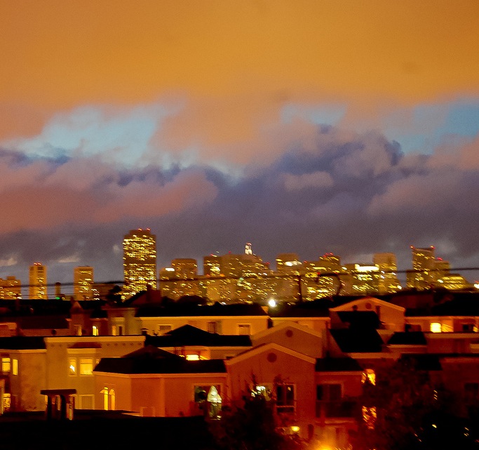 Here are two random photos from yesterday. The top one was taken from a southbound Caltrain in the morning, as Bernalwood woke up for the day; The one below was taken at sunset, as the sky exploded in a Martian orange halo: