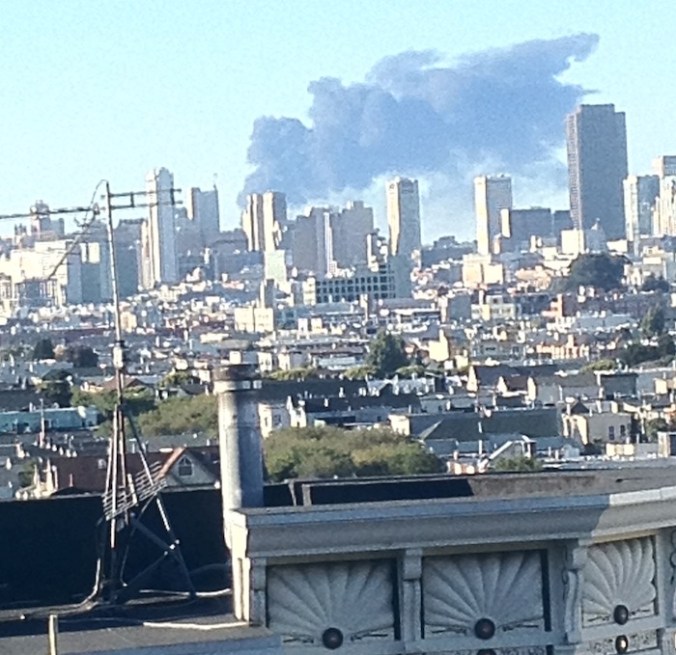 Yesterday’s big, horrible fire at the Chevron refinery in Richmond is an ecological nightmare, but on the visual side, got a clear view of it from our our Bernal Hill observation post.