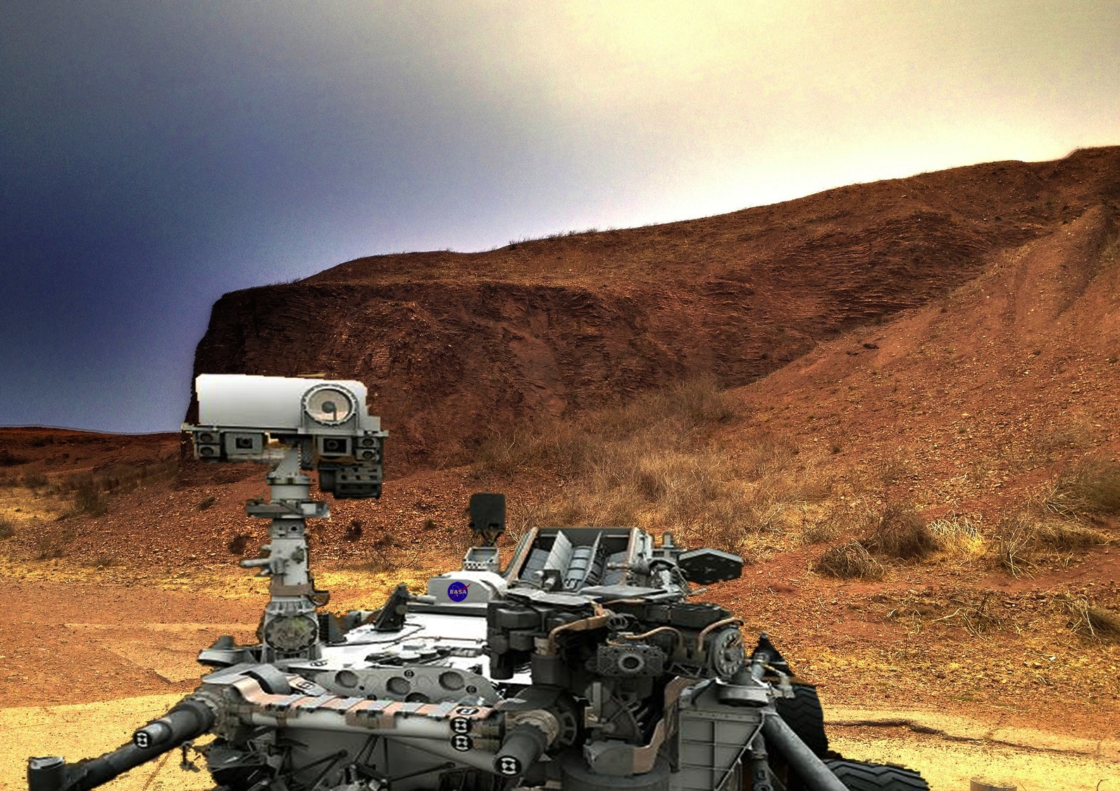 That’s right. A full reconstruction of the original image reveals the Curiosity rover perched atop Bernal Hill. But how? How can Curiosity be sitting on Bernal Hill, when we all know that right now it is parked inside a crater on Mars?