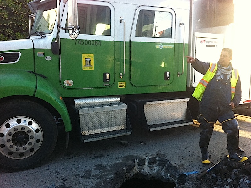I think this is related to last year’s sinkhole on Ellert @ Bennington — beware the Bernal Kraken – hope those SF water guys are appropriately armed…