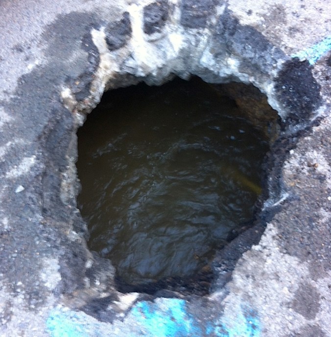 Neighbor Rachel reports there was a water main break on Ellsworth at Jarboe last night. The break created a small sinkhole that provided a rare glimpse at the watery realm that dwells just beneath our feet: