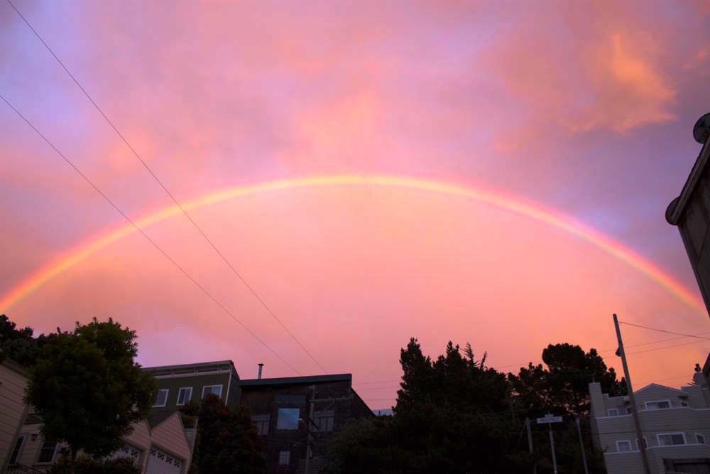 That time was last night, and the situation was an epic rainbow that erupted over Bernal Heights just as the sun was setting for the night. The skies turned pink, the light glowed orange, and a truly monumental Category Five double rainbow stretched across the sky from horizon to horizon. It happened fast. It was euphoric. But we were ready. The Citizens of Bernalwood mobilized their photographic imaging equipment, and the magic of the double rainbow was captured by many for all to see.