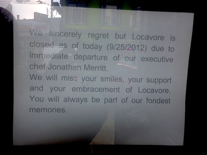 I just didn’t have the heart to publish this last week, right on the heels of the news about the closure of Four Star Video, but last week several readers wrote to say that Locavore, the classy restaurant on Mission at Valencia, had also closed its doors.