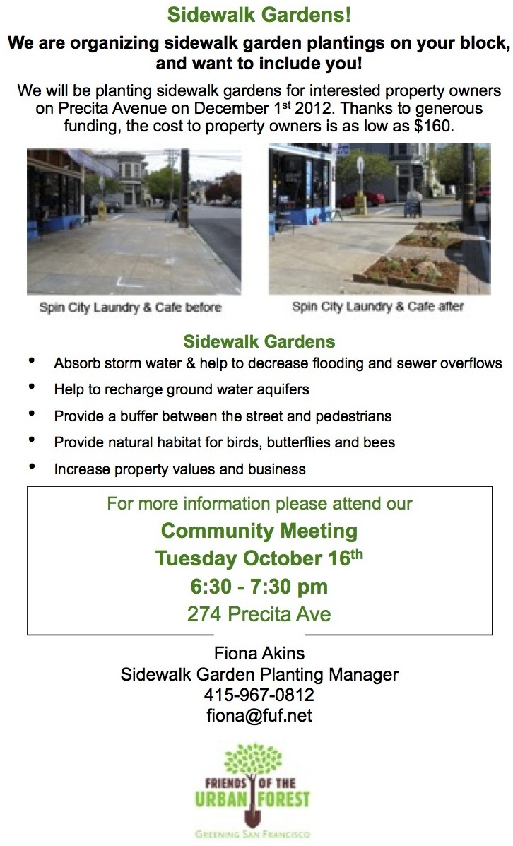Our green-thumbed friends from Friends of the Urban Forest are planning to do a sidewalk garden planting in a few weeks, and they’re looking for homes along Precita Avenue to participate. Want a garden in front of your home? Cheep? There’s an informational meeting happening tonight. Ms. Fiona from FUF tells Bernalwood: