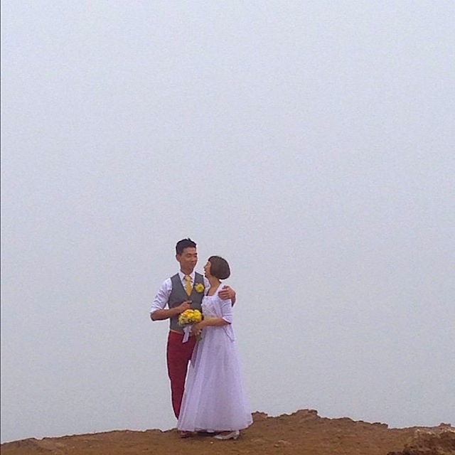 The wedding took place early on Saturday, and the young couple looked lovely amid a morning fogbank and the Mars-like terrain on Bernal Hill. Yay! Congratulations!