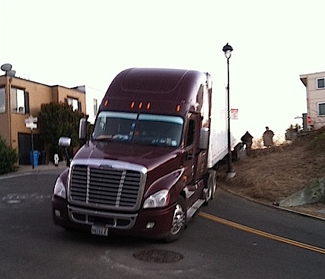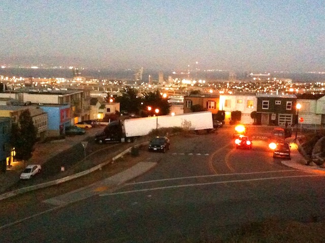 Oopsie! A lost semi truck got very very stuck in the upper reaches of Bernal Hill on Saturday night. Neighbor Mark tells the story: