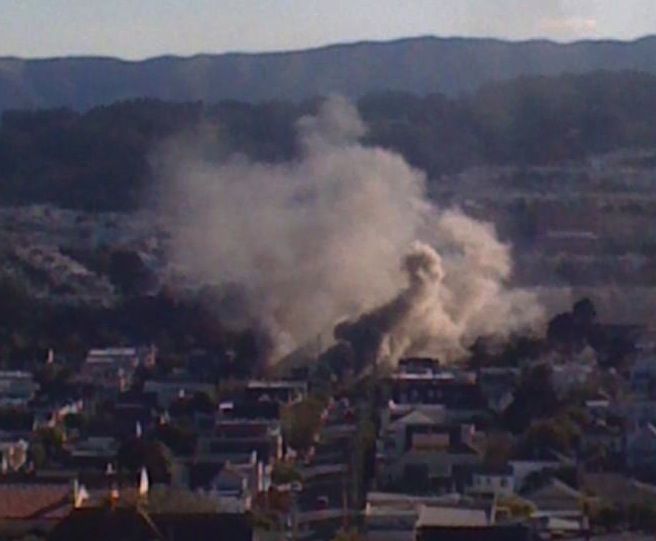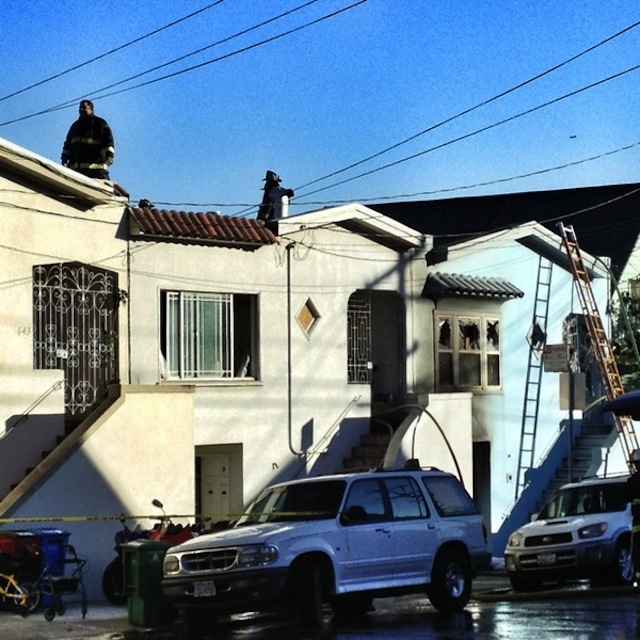 odd that SFFD said there were “flames in the attic”. that’s a flat-roofed house with no attic. (pretty confident of this, as you can see the firemen standing on the roof and that house is a mirror image of my own house on the next block.) I presume they mean the small airspace between the ceiling and the roof?