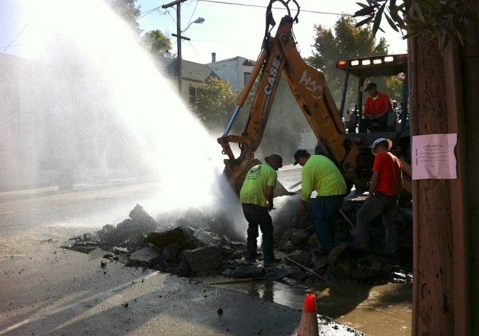 I was playing with my son at the Precita Park playground this morning when we saw a fountain of water spray from some street work they were doing on Alabama St. Turns out they were digging near a water main and hit the supply line. About 10 minutes later they managed to hammer a makeshift plug into the open pipe and stem the flow.