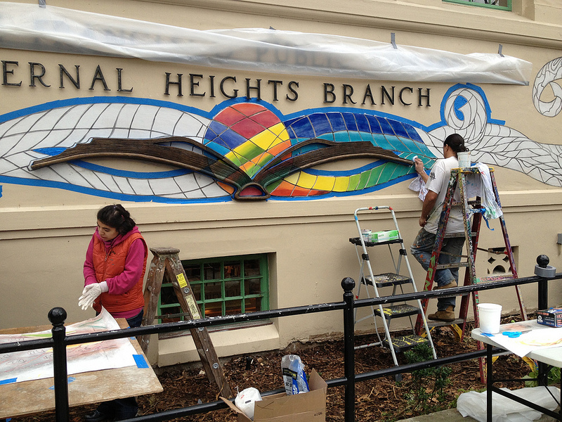 Last weekend there was a full team from Precita Eyes Murals on hand at the Bernal Heights Library to install the new artwork on the Cortland facade. What’s interesting is that — as you can see — the art is less of a mural, and more of an intricate mixed-media and tile installation. Interesting.