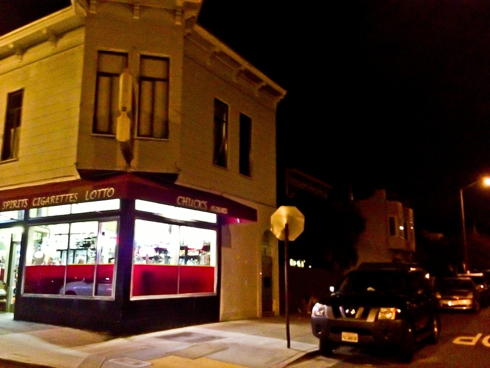 PHOTO: Chuck’s corner store at 10 pm on January 29, 2013, shortly after police left the scene. By Telstar Logistics