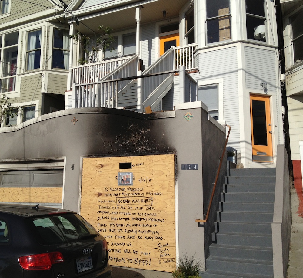 Happily, the Citizens of Bernalwood have been doing the neighborly thing by helping the family recover from the blaze, and as you can see, their efforts have been recognized in the form of a giant thank-you note written on the damaged home’s plywood-covered garage.