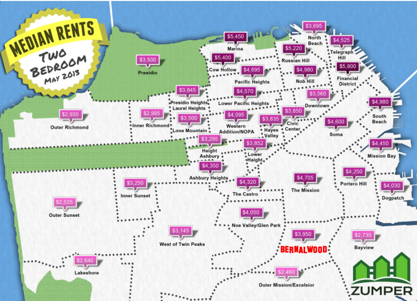 Our friends at CurbedSF tipped Bernalwood to a new study that looks at the current median cost of rental apartments for various neighborhoods across San Francisco. According to CurbedSF, the methodology is as follows: