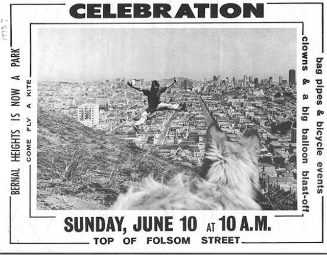 This photo has been floating around the Interwebs for a few weeks; it’s a poster/handbill for an event to commemorate the dedication of Bernal Hill as a proper park — in contrast to the mining quarry/ad hoc garbage dump/motocross track that it had been before.